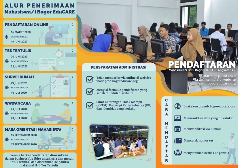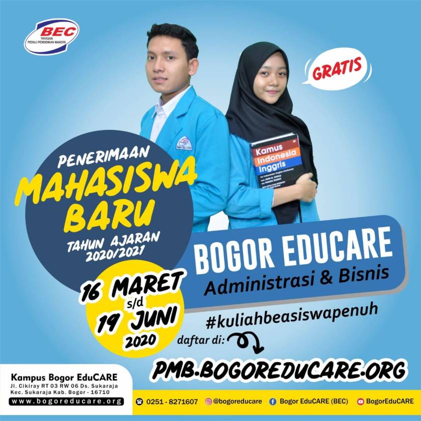 Kali ini saya akan memberikan kabar gembira kepada kalian semua, terutama kepada kalian lulusan SMA/SMK sederajat siswa-siswi tahun 2020, pasti kalian bingung kan! sebentar lagi lulus tapi kalian belom tau mau ngelanjutin kemana? mau kerja tapi belum berpengalaman, mau kuliah tapi terkendala dengan biaya. Nah pas banget nih, saya punya solusinya, kini Bogor Educare sudah membuka pendaftaran mahasiswa baru angkatan 24 tahun 2020-2021. Yuk simak lebih lanjut apasih Bogor Educare itu….
