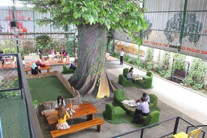Di tambah dengan ditemani interior pepohonan berakar besar, bernuansa hijau dengan rumput sintetis sudah pasti itu akan menyegarkan mata kalian semua ketika mengunjungi nya.